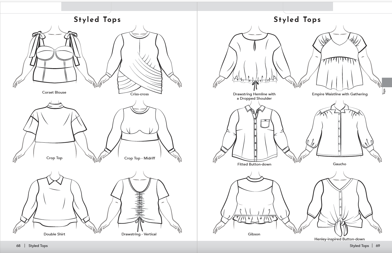This book contains flat garment sketches. A flat sketch is a 2-dimensional visual of how the garment looks from an overhead perspective when it is flat on a table. Flat sketches are more accurate in the design proportions, helping the designer envision the style and plan the sewing process.