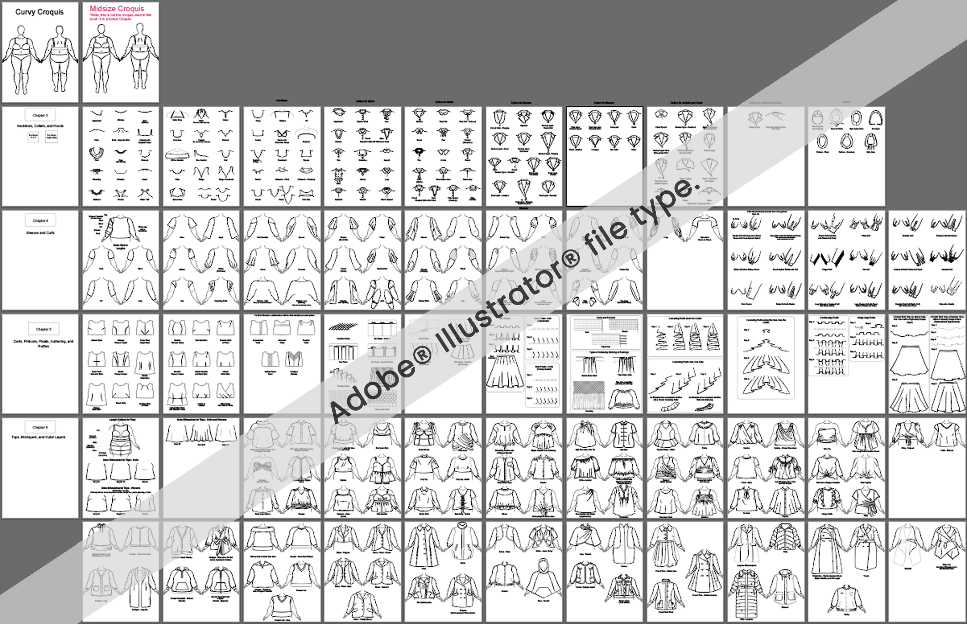 The entire book is a mix-and-match library of sketches to assist you in creating your designs. You select the parts you want. For example, choose one neckline, sleeve design, and dress silhouette to create a unique style. This bundle 3-pack includes the Adobe® Illustrator®, Procreate®, and PDF versions of the book. The PDF version is the complete version of the book, including all the QR codes linking to the videos. The Adobe® Illustrator® and Procreate® versions include the sketches and no QR codes or main text. Refer to the PDF version for these parts.